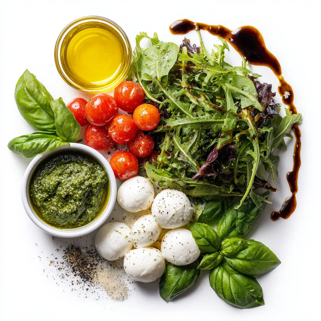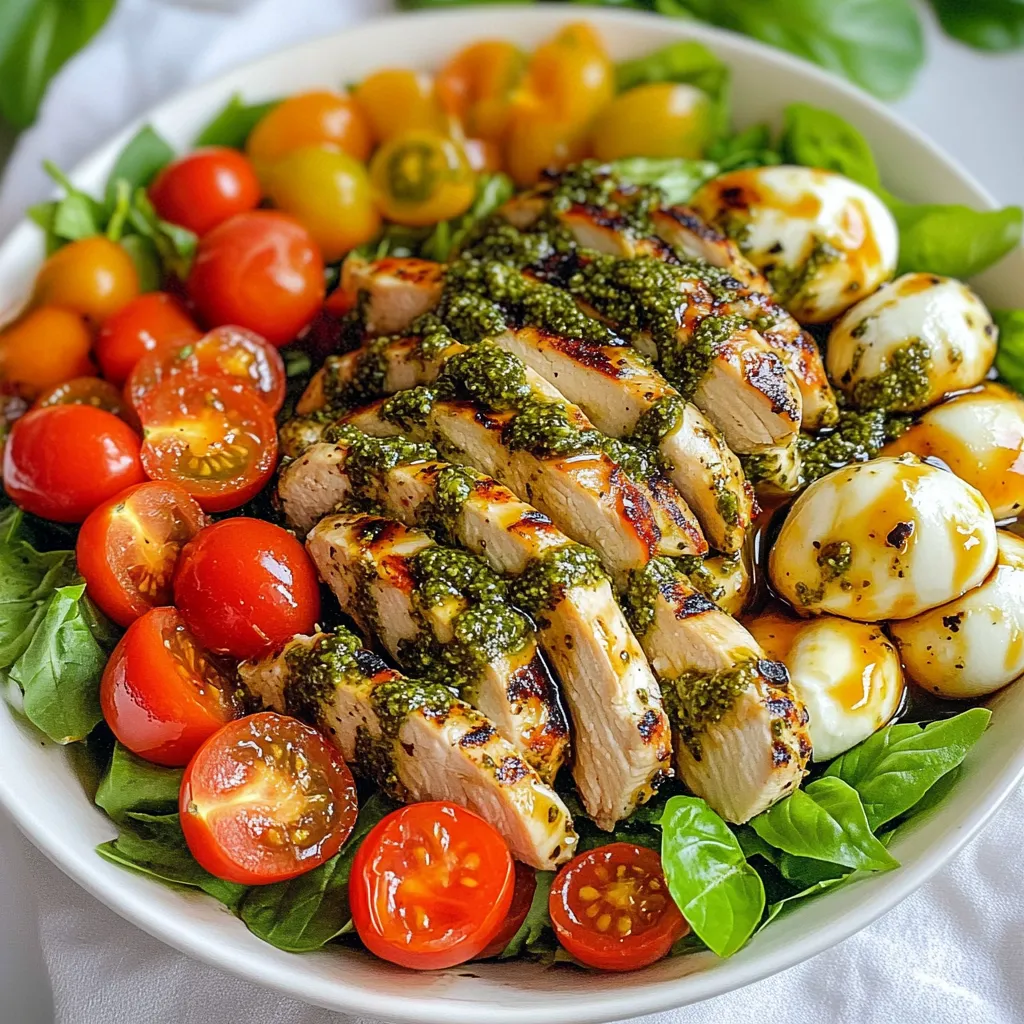 A delicious salad featuring grilled chicken breast, fresh mozzarella, cherry tomatoes, and basil pesto.