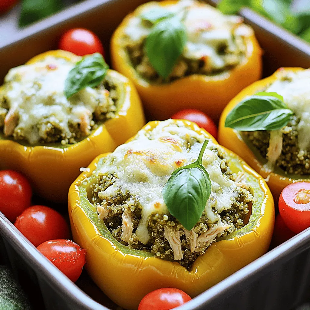 Entdecken Sie das köstliche Rezept für Pesto Chicken gefüllte Paprika, das einfach zuzubereiten ist! Diese farbenfrohen Paprika sind gefüllt mit zartem Hühnchen, nahrhafter Quinoa, frischen Kirschtomaten und viel Pesto. Perfekt geschichtet mit geschmolzenem Käse, sind sie ein echter Hit beim Abendessen. Lassen Sie sich inspirieren und klicken Sie, um das vollständige Rezept zu entdecken und Ihre Familie zu beeindrucken!