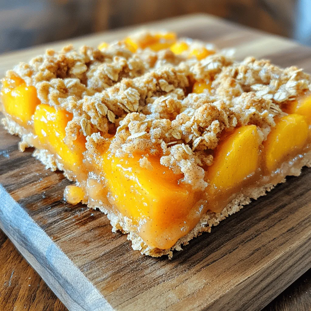 Die Mengen sind wichtig, um das beste Geschmackserlebnis zu erzielen. Ich empfehle, die Pfirsiche gut zu messen. Sie sollten frisch und saftig sein. Die Mischungen von Haferflocken und Mehl geben den Riegeln die richtige Textur. Achte auf die Butter, sie muss geschmolzen sein, um die Krümelstruktur zu erreichen. Verwende auch frischen Zitronensaft für den besten Geschmack.