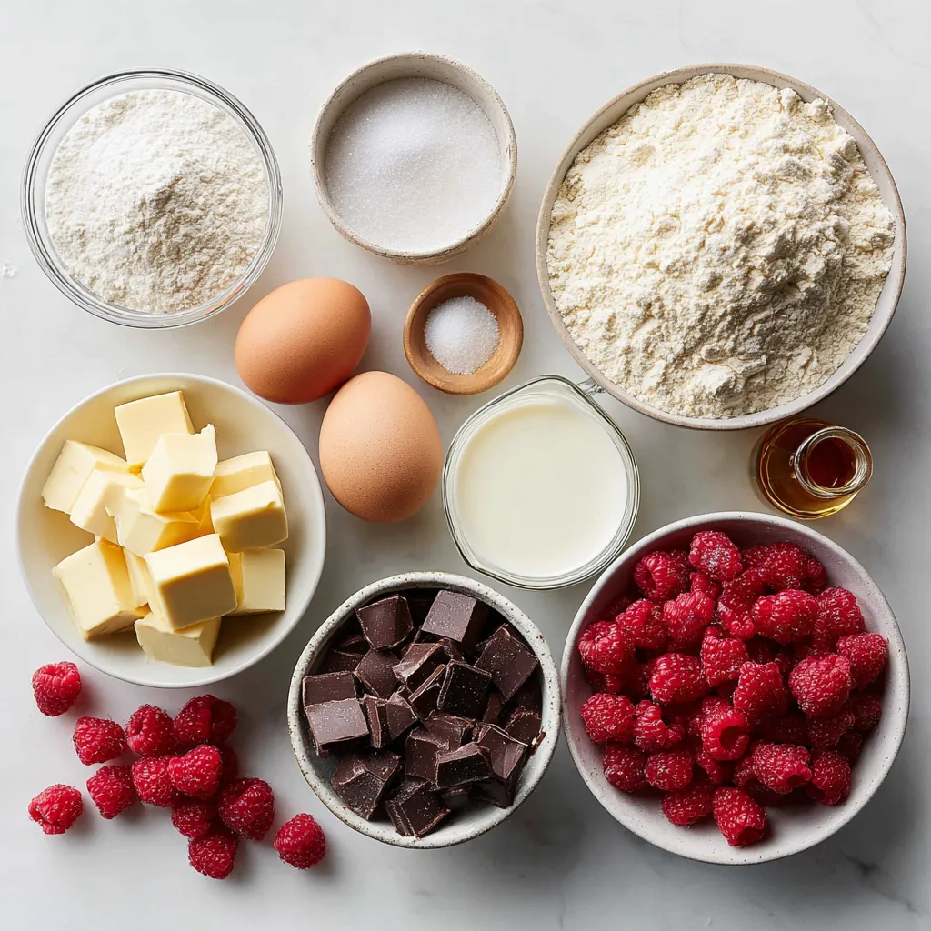 Jede Zutat hat ihren Zweck. Das Weizenmehl gibt Struktur. Kristallzucker sorgt für Süße. Backpulver hilft beim Aufgehen. Salz hebt den Geschmack. Kalte Butter macht die Scones fluffig und zart. Schlagsahne bringt Feuchtigkeit und einen reichen Geschmack. Das Ei bindet alles zusammen. Vanilleextrakt fügt Tiefe hinzu. Himbeeren und Schokoladenstückchen sorgen für den Genuss.