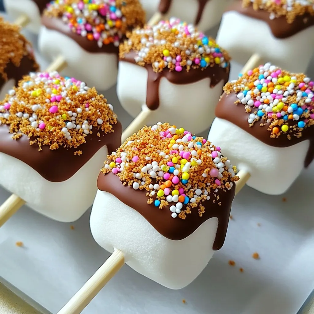 Toppings hinzufügen: Streuen Sie sofort bunte Streusel oder zerbröselte Graham-Cracker über die geschmolzene Schokolade. Legen Sie den getauchten Marshmallow zurück auf das mit Backpapier ausgelegte Backblech.