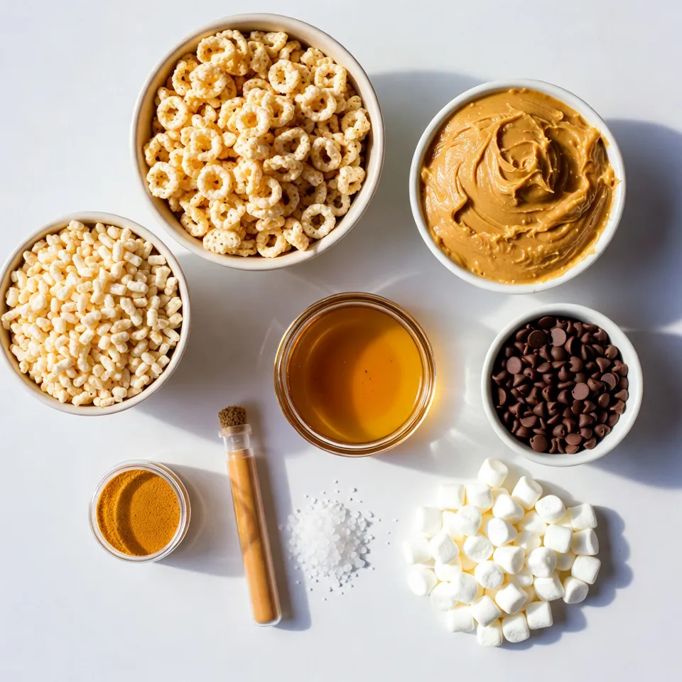 Die Hauptzutaten sind einfach zu finden. Rice Krispies bieten den perfekten Crunch. Cremige Erdnussbutter sorgt für einen tollen Geschmack. Die Schokoladenstückchen bringen eine süße Note. Honig oder Ahornsirup machen die Riegel klebrig und süß.