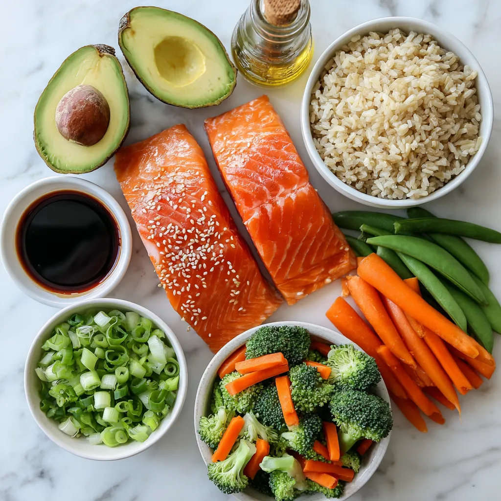 Liste der Zutaten für Sesam-Teriyaki-Lachs-Bowls