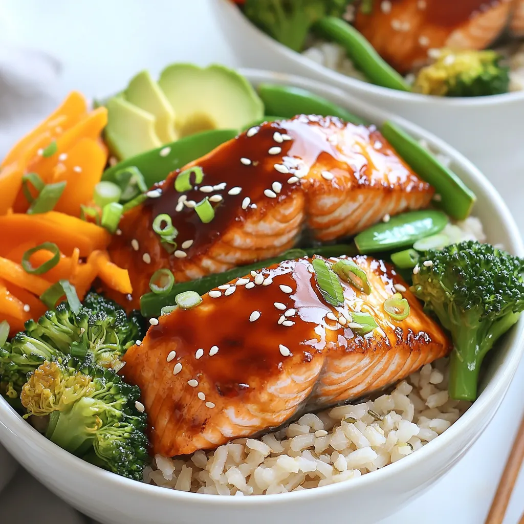 Leckere Lachs-Bowls mit Teriyaki-Sauce und gedämpftem Gemüse.