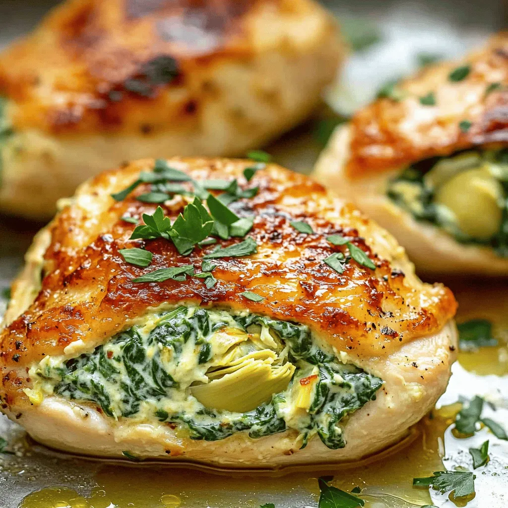- 4 Hähnchenbrustfilets, ohne Haut und Knochen - 1 Tasse frischer Spinat, grob gehackt - 1 Tasse Artischockenherzen, abgetropft und grob gehackt Die Hauptzutaten sind einfach und frisch. Die Hähnchenbrust ist mager und zart. Spinat bringt Farbe und Vitamine. Artischockenherzen fügen einen tollen Geschmack hinzu. Diese Mischung macht das Gericht besonders. - 1 Tasse Frischkäse, weich - 1/2 Tasse geriebener Parmesan - 1/2 Tasse geriebener Mozzarella - 2 Knoblauchzehen, fein gehackt - 1 Teelöffel Zitronensaft - Salz und Pfeffer nach Geschmack Der Käse macht die Füllung cremig. Frischkäse sorgt für eine glatte Textur. Parmesan bringt einen herzhaften Geschmack. Mozzarella schmilzt schön. Knoblauch fügt eine würzige Note hinzu. Zitronensaft gibt Frische. Salz und Pfeffer runden alles ab. - Ofenfeste Pfanne - Schüssel - Zahnstocher Die richtigen Utensilien machen das Kochen leichter. Eine ofenfeste Pfanne ist wichtig für das Anbraten und Backen. Eine Schüssel hilft beim Mischen der Füllung. Zahnstocher sind nützlich, um die Hähnchenbrust zu sichern. Um alle Schritte und Details zu sehen, schau dir das Full Recipe an. Heize zuerst deinen Ofen auf 190°C (375°F) vor. Dies ist wichtig, damit das Hähnchen gleichmäßig gart. In einer Schüssel rührst du dann die Spinat- und Artischockenmischung an. Mische 1 Tasse frischen Spinat, 1 Tasse abgetropfte Artischockenherzen, 1 Tasse weichen Frischkäse, 1/2 Tasse geriebenen Parmesan, 1/2 Tasse geriebenen Mozzarella, 2 fein gehackte Knoblauchzehen und 1 Teelöffel Zitronensaft. Vergiss nicht, etwas Salz und Pfeffer nach Geschmack hinzuzufügen. Rühre alles gut durch, bis die Mischung gleichmäßig ist. Jetzt ist es Zeit, die Hähnchenbrust vorzubereiten. Schneide vorsichtig eine Tasche in die Seite jedes Hähnchenbrustfilets. Achte darauf, dass du nicht ganz durch das Fleisch schneidest. Fülle dann jede Hähnchenbrust mit der Spinat-Artischocken-Mischung. Wenn nötig, kannst du die Öffnung mit Zahnstochern sichern. So bleibt die Füllung an ihrem Platz und läuft nicht heraus. Erhitze in einer großen, ofenfesten Pfanne 1 Esslöffel Olivenöl bei mittlerer bis hoher Hitze. Wenn das Öl heiß ist, lege die gefüllten Hähnchenbrüste hinein. Brate sie etwa 4-5 Minuten auf jeder Seite, bis sie goldbraun sind. Übertrage dann die Pfanne in den vorgeheizten Ofen. Backe die Hähnchenbrüste für 25-30 Minuten oder bis sie durchgegart sind. Die innere Temperatur sollte 75°C (165°F) erreichen. Nimm die Pfanne aus dem Ofen und lasse die Hähnchenbrüste 5 Minuten ruhen, bevor du die Zahnstochern entfernst. Garniere sie mit gehackter Petersilie, um das Gericht schön zu präsentieren. Für die vollständige Anleitung, schaue dir die Full Recipe an. Um die beste Füllung zu machen, mische alles gut. Verteile die Mischung gleichmäßig in jede Hähnchenbrust. Das sorgt für einen tollen Geschmack in jedem Bissen. Du kannst auch verschiedene Käsesorten verwenden. Probiere Feta oder Cheddar für einen neuen Geschmack. Diese Käsesorten geben der Füllung einen anderen, aber leckeren Twist. Die Innentemperatur ist sehr wichtig. Achte darauf, dass sie 75°C (165°F) erreicht. Das garantiert, dass das Hähnchen sicher zu essen ist. Wenn du dickere Hähnchenbrüste verwendest, passe die Garzeit an. Es kann sein, dass sie länger im Ofen bleiben müssen. Ein gutes Fleischthermometer hilft dir, genau zu messen. Bei der Auswahl der Beilagen sind frische Salate eine tolle Wahl. Sie bringen Farbe und Frische auf den Teller. Geröstetes Gemüse passt auch gut dazu. Für Saucen oder Dips probiere einen leckeren Knoblauchdip oder eine cremige Joghurtsoße. Diese Ergänzungen machen das Gericht noch schmackhafter und interessanter. {{image_4}} Du kannst deine Spinach Artichoke Stuffed Chicken aufpeppen. Füge Gemüse wie Paprika oder Zucchini hinzu. Diese Optionen bringen Farbe und Geschmack. Auch verschiedene Käsesorten sind möglich. Probiere Feta oder Cheddar für einen anderen Geschmack. Diese Käsesorten geben deiner Füllung eine neue Note. Wenn du eine vegane oder vegetarische Option suchst, gibt es viele Wege. Ersetze das Hähnchen durch Portobello-Pilze oder Auberginen. Diese Alternativen fügen eine herzhafte Textur hinzu. Du kannst auch Tofu verwenden. Tofu nimmt die Aromen gut auf und ist eine gesunde Wahl. Geflügelersatzprodukte sind ebenfalls eine gute Idee, da sie oft proteinreich sind. Um den Geschmack zu vertiefen, füge Gewürze hinzu. Mediterrane Aromen wie Oregano oder Basilikum passen sehr gut. Diese Kräuter verleihen deinem Gericht Frische. Auch italienische Kräuter sind eine tolle Wahl. Sie bringen ein klassisches Flair in deine Füllung. Denk daran, die Gewürze nach deinem Geschmack zu dosieren. So machst du das Gericht noch interessanter. Für das vollständige Rezept besuche die [Full Recipe]. Um die gefüllten Hähnchenbrüste frisch zu halten, lagere sie in einem luftdichten Behälter. Stelle sicher, dass die Reste gut abgekühlt sind, bevor du sie einpackst. So bleibt der Geschmack und die Textur erhalten. Die Reste sind im Kühlschrank bis zu drei Tage haltbar. Wenn du sie länger aufbewahren möchtest, ist das Einfrieren eine gute Option. Um die gefüllten Hähnchenbrüste einzufrieren, lege sie in einen gefriergeeigneten Behälter oder in einen Gefrierbeutel. Achte darauf, die Luft herauszudrücken, um Gefrierbrand zu vermeiden. So bleiben die Hähnchenbrüste bis zu drei Monate frisch. Wenn du bereit bist, sie zu essen, nimm die Hähnchenbrüste aus dem Gefrierfach und lege sie über Nacht in den Kühlschrank, um sie langsam aufzutauen. Damit bleibt die beste Konsistenz erhalten. Du kannst sie auch direkt im Ofen oder in der Mikrowelle auftauen, aber achte darauf, die Temperatur niedrig zu halten, damit sie nicht garen. Die Zubereitungszeit für Spinats-Artischocken gefülltes Hähnchen beträgt etwa 15 Minuten. Die Gesamtzeit ist rund 50 Minuten. Diese Zeit umfasst das Vorbereiten, Braten und Backen des Hähnchens.