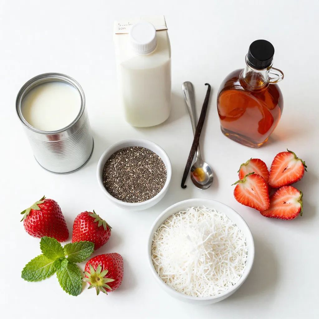 Hier sind die Zutaten, die du für den Erdbeer-Kokos-Chia-Pudding brauchst: