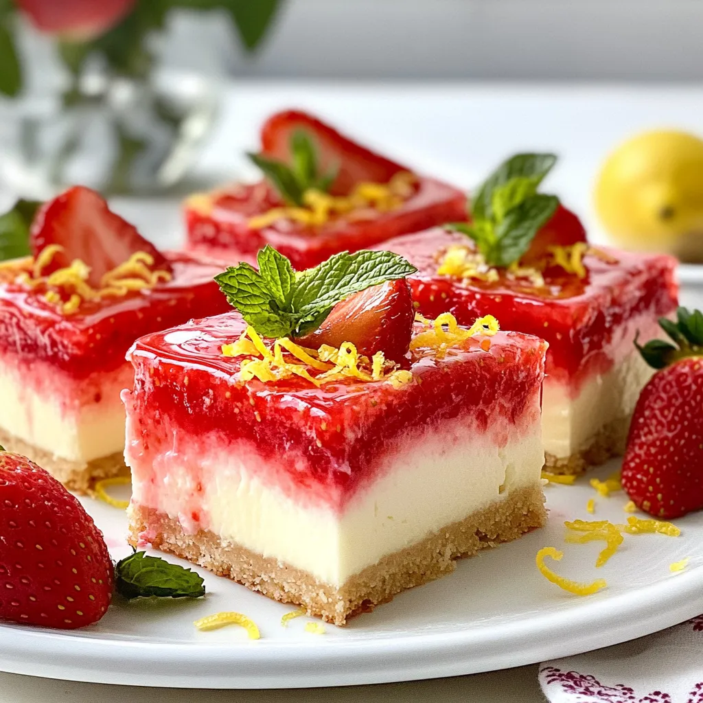Wenn du bereit bist zu servieren, ziehe die Käsekuchen-Riegel mit Hilfe des Überhangs aus der Form, schneide sie in Quadrate und garniere sie nach Wunsch mit frischen Erdbeerscheiben und einem Hauch Zitronenabrieb.
