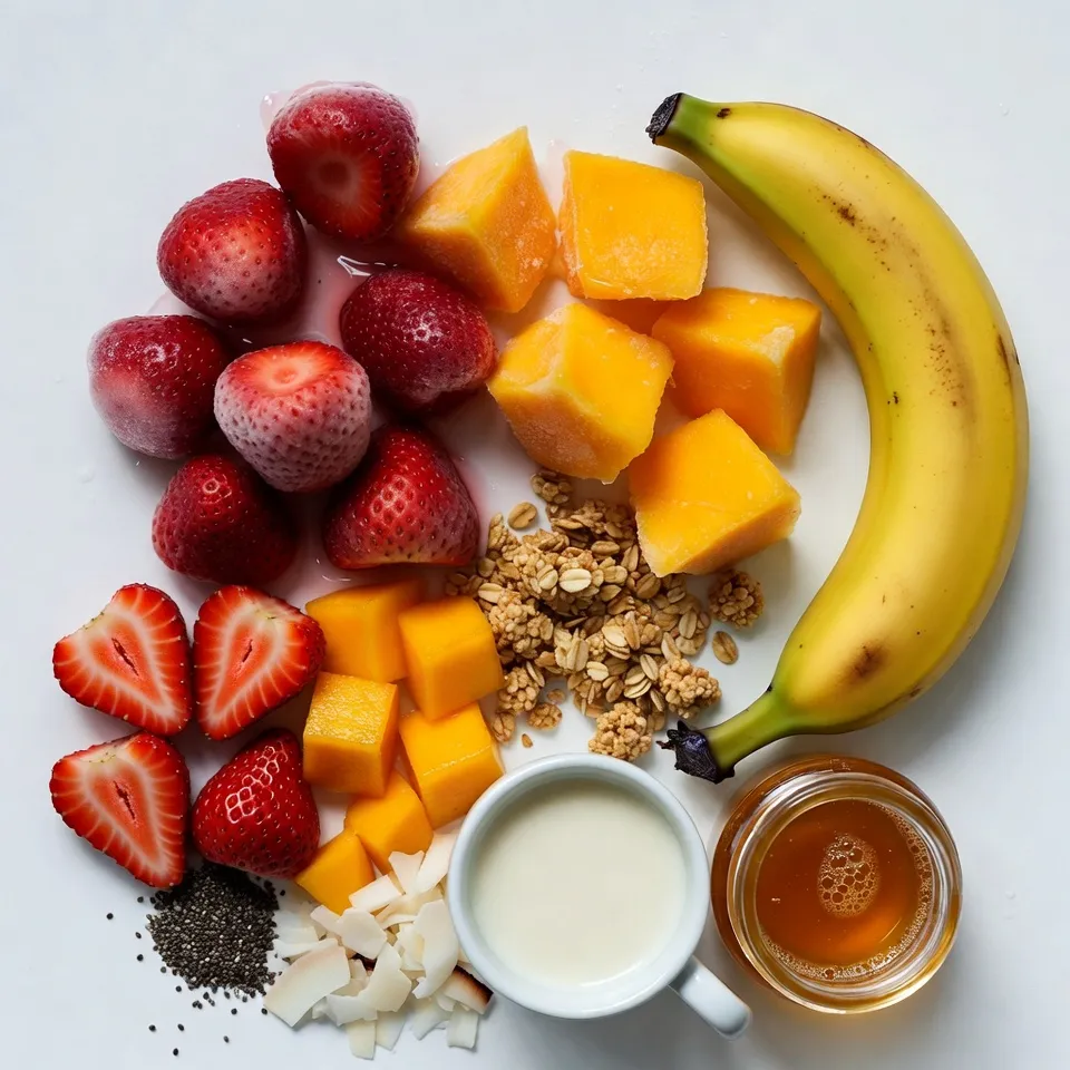 Diese Zutaten machen die Basis für Ihre Smoothie-Bowl. Gefrorene Erdbeeren und Mangostücke sorgen für einen frischen, fruchtigen Geschmack. Die Banane bringt eine natürliche Süße und cremige Textur. Mandelnmilch ist eine tolle Wahl, um alles zu verbinden.