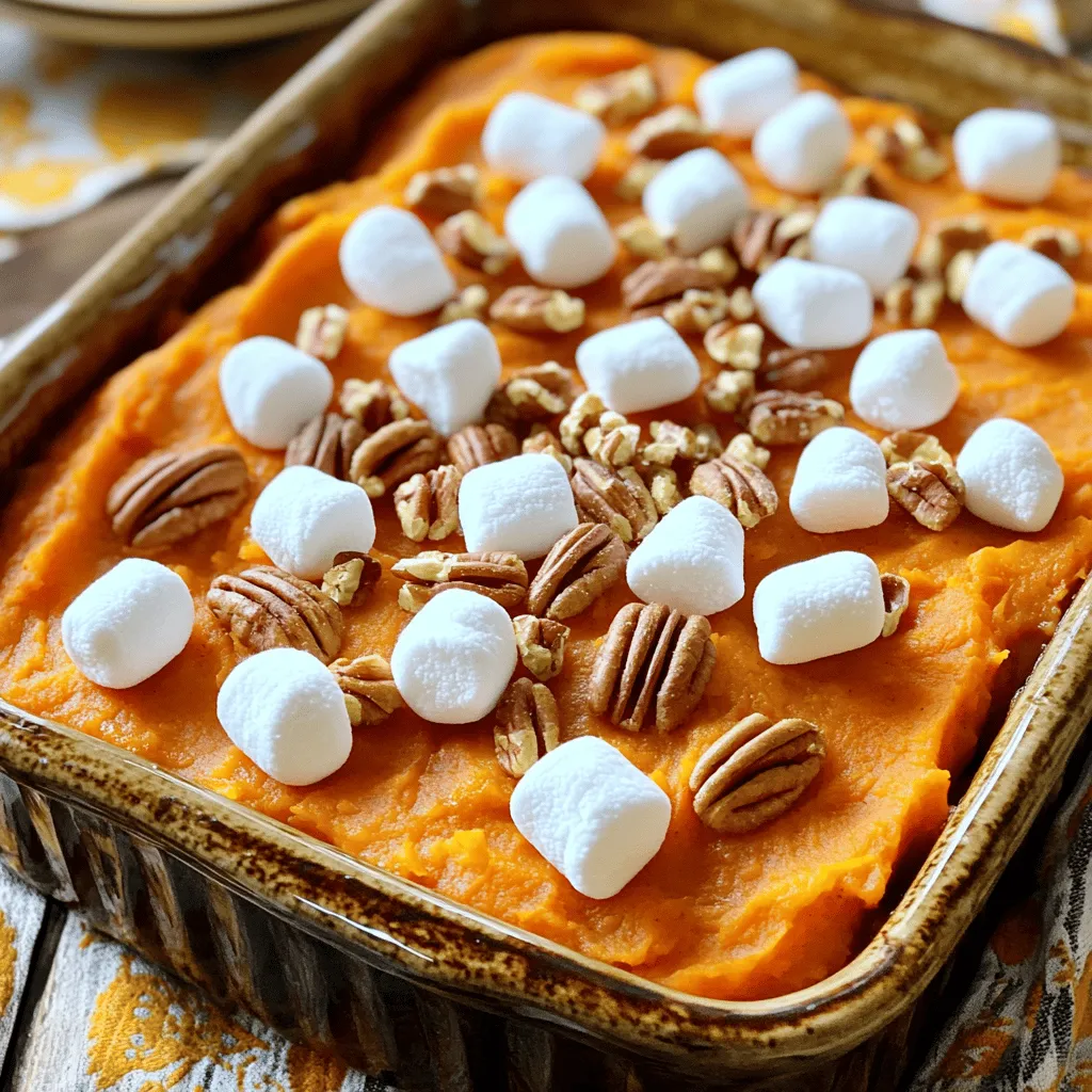 Für den perfekten Süßkartoffelauflauf brauchen wir einige Hauptzutaten: - 4 mittelgroße Süßkartoffeln, geschält und gewürfelt - 1/2 Tasse brauner Zucker - 1/4 Tasse Butter, geschmolzen - 1/2 Tasse Milch - 1 Teelöffel Vanilleextrakt - 1/2 Teelöffel gemahlener Zimt - 1/4 Teelöffel Muskatnuss - 1/4 Teelöffel Salz Diese Zutaten geben dem Auflauf seine süße und cremige Basis. Die Süßkartoffeln sind der Star des Gerichts, und der braune Zucker sorgt für eine köstliche Süße. Die Butter und die Milch machen den Auflauf schön cremig. Zusätzlich zu den Hauptzutaten gibt es einige Optionen, um den Geschmack zu verbessern: - 2 Tassen Mini-Marshmallows - 1/2 Tasse gehackte Pekannüsse (optional) Die Mini-Marshmallows geben dem Auflauf eine süße, klebrige Schicht oben drauf. Die Pekannüsse fügen einen tollen Crunch und eine nussige Note hinzu. Sie sind optional, aber sehr empfehlenswert! Die Präsentation ist wichtig, also hier sind einige Ideen zur Dekoration: - Eine Prise Zimt als Topping - Geröstete Pekannüsse für extra Crunch Diese einfachen Dekorationen machen den Auflauf noch ansprechender. Sie helfen, die Farben und Texturen hervorzuheben. So wird der Süßkartoffelauflauf nicht nur lecker, sondern sieht auch toll aus! Zuerst schälen Sie die Süßkartoffeln. Schneiden Sie sie in gleichmäßige Würfel. Dies hilft beim Kochen. Kochen Sie die Würfel in einem großen Topf mit gesalzenem Wasser. Lassen Sie sie etwa 15 bis 20 Minuten kochen, bis sie zart sind. Prüfen Sie mit einer Gabel, ob sie weich sind. Wenn sie fertig sind, lassen Sie sie abtropfen und kurz abkühlen. In einer großen Schüssel nehmen Sie die gekochten Süßkartoffeln. Pürieren Sie sie mit einem Kartoffelstampfer oder Mixer. Achten Sie darauf, eine glatte Konsistenz zu erreichen. Fügen Sie nun den braunen Zucker, die geschmolzene Butter, die Milch, den Vanilleextrakt, den Zimt, die Muskatnuss und das Salz hinzu. Mischen Sie alles gut. Die Mischung sollte gleichmäßig und cremig sein. Heizen Sie Ihren Ofen auf 175°C vor. Greifen Sie eine gefettete Auflaufform. Übertragen Sie die Süßkartoffelmischung in die Form. Glätten Sie die Oberfläche mit einem Spatel. Backen Sie den Auflauf für 25 bis 30 Minuten. Er sollte durchgehend warm sein. Nach dem Backen nehmen Sie die Form heraus und streuen die Mini-Marshmallows gleichmäßig darüber. Optional können Sie die gehackten Pekannüsse hinzufügen. Stellen Sie die Form zurück in den Ofen und backen Sie sie für weitere 10 bis 15 Minuten. Die Marshmallows sollten goldbraun und aufgebläht sein. Lassen Sie den Auflauf kurz abkühlen, bevor Sie ihn servieren. Die ideale Backtemperatur für den Süßkartoffelauflauf ist 175°C (350°F). So wird er gleichmäßig warm. Backen Sie den Auflauf zuerst für 25-30 Minuten. So wird die Süßkartoffelmischung gut erhitzt. Danach streuen Sie die Mini-Marshmallows oben drauf. Backen Sie ihn dann für weitere 10-15 Minuten. Dies macht die Marshmallows goldbraun und fluffig. Achten Sie darauf, den Auflauf nicht zu lange zu backen, um ein Verbrennen zu vermeiden. Um die perfekte Konsistenz zu erreichen, kochen Sie die Süßkartoffeln in gesalzenem Wasser. Kochen Sie sie etwa 15-20 Minuten, bis sie zart sind. Danach lassen Sie sie abtropfen und leicht abkühlen. Verwenden Sie dann einen Kartoffelstampfer oder Mixer. Pürieren Sie die Süßkartoffeln, bis sie ganz glatt sind. Eine gleichmäßige Mischung sorgt für ein besseres Geschmackserlebnis. Für ein großartiges Marshmallow-Topping wählen Sie Mini-Marshmallows. Sie schmelzen schneller und gleichmäßiger. Streuen Sie sie gleichmäßig über den Auflauf. Wenn Sie eine extra knackige Textur wollen, fügen Sie gehackte Pekannüsse hinzu. Diese geben zusätzlichen Crunch und Geschmack. Achten Sie darauf, den Auflauf beim Backen genau zu beobachten. So vermeiden Sie verbrannte Marshmallows und erhalten die perfekte goldene Farbe. {{image_4}} Wenn Sie den Süßkartoffelauflauf aufpeppen möchten, gibt es viele tolle Alternativen. Statt Mini-Marshmallows können Sie auch Karamellsauce verwenden. Das gibt dem Auflauf eine süße Note. Ein weiterer Vorschlag ist, geriebene Kokosnüsse hinzuzufügen. Kokosnüsse geben einen tropischen Geschmack und eine interessante Textur. Wenn Sie Nüsse mögen, versuchen Sie Walnüsse oder Mandeln. Diese geben einen schönen Crunch. Für Menschen mit speziellen Diäten gibt es viele Anpassungen. Wenn Sie vegan leben, ersetzen Sie die Butter durch pflanzliche Margarine. Verwenden Sie auch eine pflanzliche Milch, wie Mandel- oder Sojamilch. Für glutenfreie Optionen können Sie darauf achten, dass alle Zutaten glutenfrei sind. So bleibt der Auflauf für alle geeignet. Bei Zuckerkontrolle können Sie den braunen Zucker durch Kokoszucker oder Stevia ersetzen. Um den Auflauf interessanter zu machen, können Sie verschiedene Gewürze hinzufügen. Zum Beispiel passt Ingwer gut zu Süßkartoffeln. Auch eine Prise Cayennepfeffer gibt eine leichte Schärfe. Für mehr Frische können Sie Zitrusschalen wie Orange oder Zitrone hinzufügen. Diese bringen eine tolle Frische in den Auflauf. Experimentieren Sie mit verschiedenen Zutaten, um Ihren eigenen einzigartigen Auflauf zu kreieren. Um den Süßkartoffelauflauf frisch zu halten, kühlen Sie ihn schnell ab. Decken Sie die Auflaufform mit Frischhaltefolie ab. Alternativ können Sie den Auflauf in einen luftdichten Behälter umfüllen. So bleibt er bis zu fünf Tage im Kühlschrank haltbar. Achten Sie darauf, dass der Auflauf vollständig abgekühlt ist, bevor Sie ihn abdecken. Wenn Sie den Auflauf länger aufbewahren möchten, frieren Sie ihn ein. Lassen Sie den Auflauf vor dem Einfrieren vollständig abkühlen. Wickeln Sie ihn fest in Frischhaltefolie und dann in Alufolie ein. So bleibt er bis zu drei Monate frisch. Wenn Sie ihn wieder auftauen, lassen Sie ihn über Nacht im Kühlschrank. Um den Auflauf wieder aufzuwärmen, heizen Sie den Ofen auf 175°C vor. Decken Sie die Auflaufform mit A