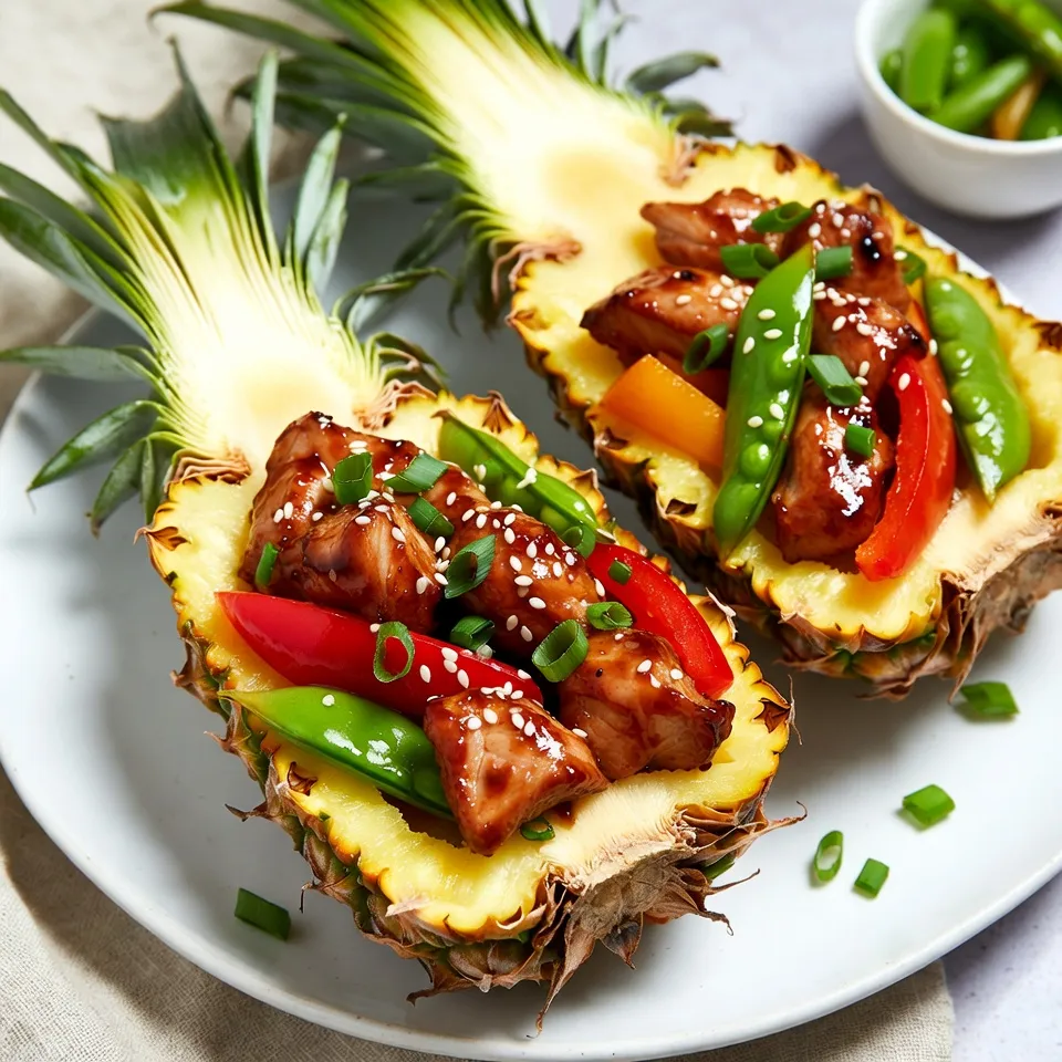 Eine köstliche Kombination aus Hähnchen, Ananas und Gemüse, serviert in Ananas-Schalen.