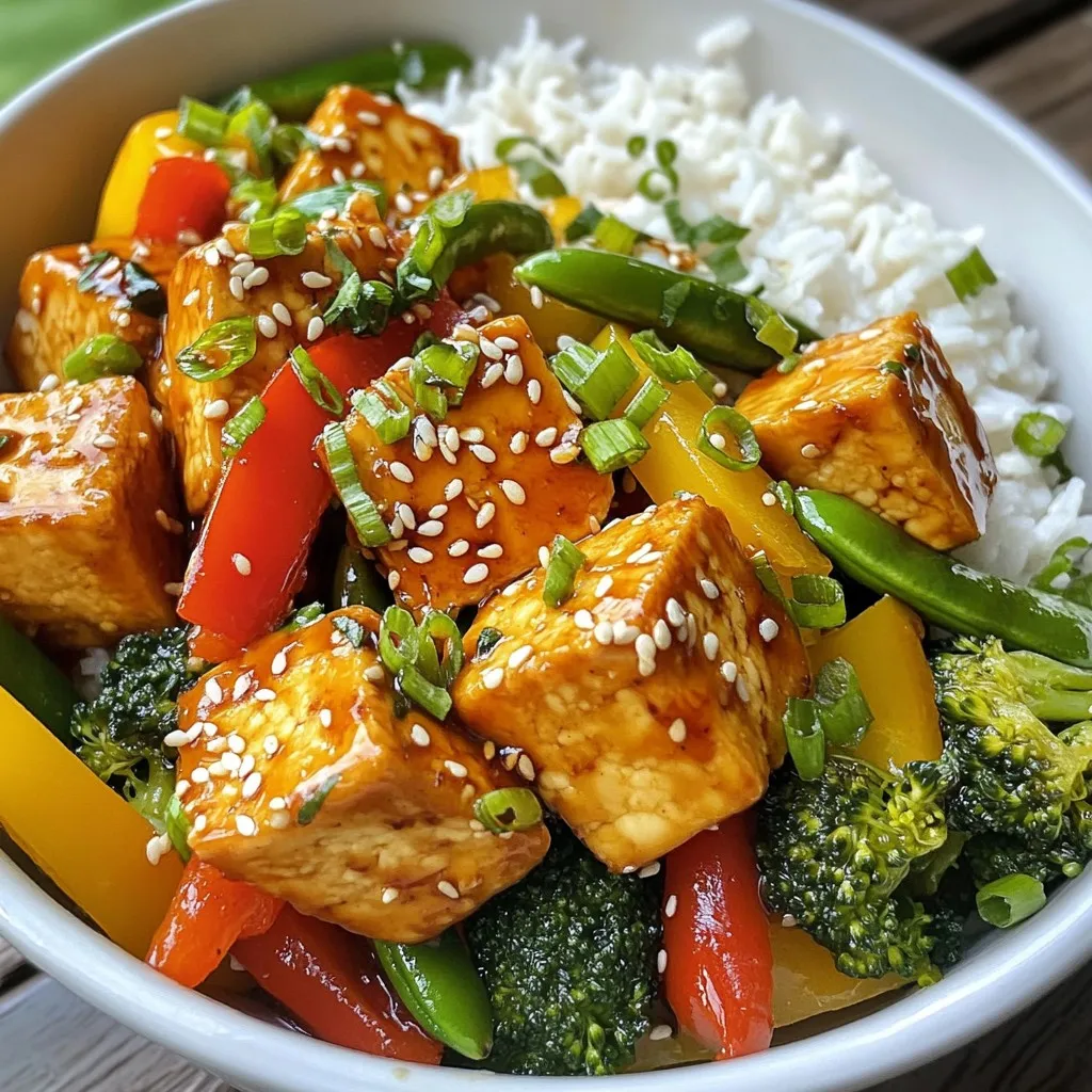 Ein köstliches und gesundes Gericht mit Tofu und frischem Gemüse in einer würzigen Teriyaki-Sauce.