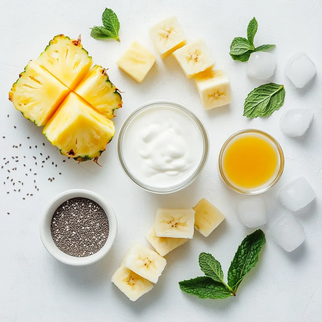 Die Hauptzutaten für Ihren tropischen Smoothie sind einfach und frisch. Ananas ist süß und hat viel Saft. Banane gibt dem Smoothie eine cremige Konsistenz. Kokosnussmilch bringt einen milden, tropischen Geschmack. Der griechische Joghurt sorgt für eine proteinreiche Basis.