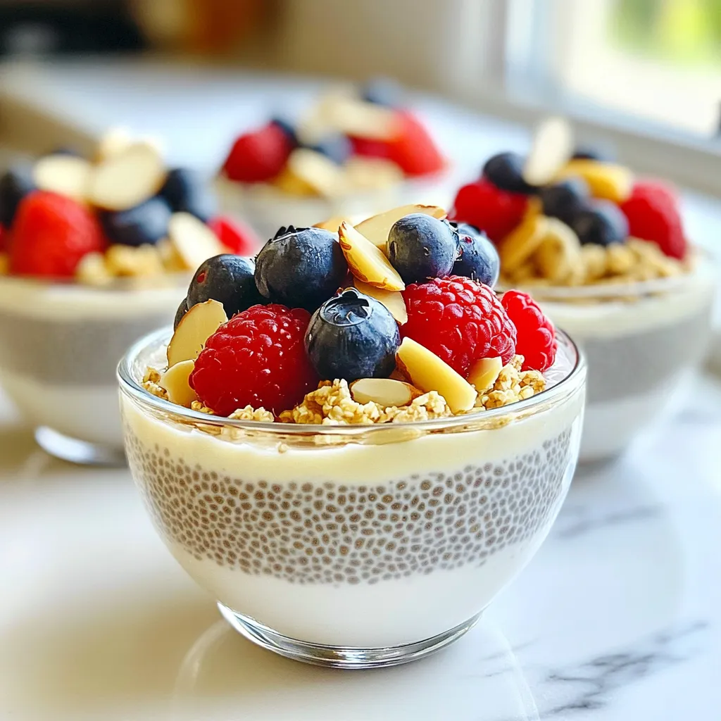 Den Chiapudding in kleinen Schalen oder Gläsern anrichten und nach Belieben mit frischen Beeren sowie einer Prise geschnittener Mandeln für zusätzlichen Crunch garnieren.