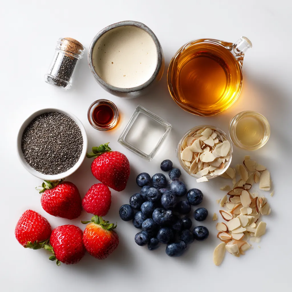 In diesem Rezept sind die Hauptzutaten einfach und gesund. Chiasamen sind klein, aber mächtig. Sie sind reich an Ballaststoffen und Omega-3-Fettsäuren. Mandelmilch bringt einen nussigen Geschmack und ist eine tolle Milch-Alternative. Ahornsirup oder Honig sorgt für die süße Note. Du kannst sie nach deinem Geschmack anpassen.