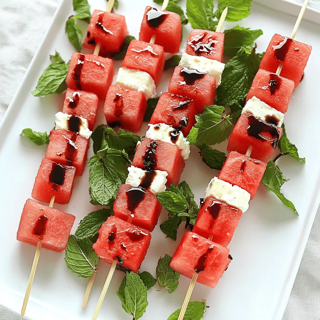 Um die besten Wassermelonen-Feta-Spieße zu machen, achte auf die Auswahl der Zutaten. Frische Wassermelonen sind wichtig. Wähle eine, die schwer und fest ist. Der Klang, wenn du darauf klopfst, sollte hohl sein. Das zeigt, dass die Melone reif ist. Der Feta sollte bröckelig und cremig sein. Das gibt den Spießen den besten Geschmack.