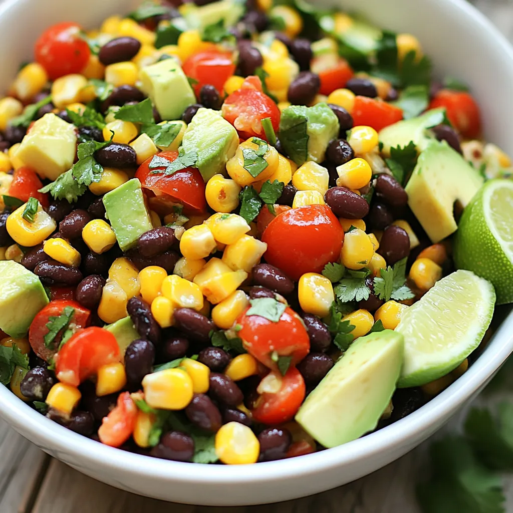 Du kannst viele Zutaten anpassen, um den Salat vegan zu machen. Die schwarzen Bohnen und der Mais sind schon vegan. Statt Koriander kannst du Petersilie verwenden, wenn du das magst. Die Avocado gibt eine tolle Cremigkeit. Wenn du das Dressing machst, achte darauf, dass das Olivenöl frisch ist. Das bringt mehr Geschmack.