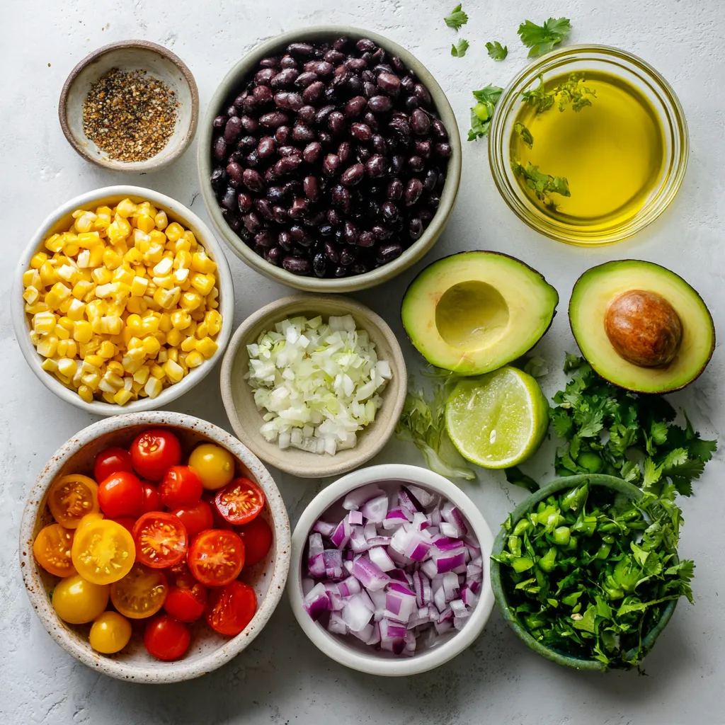 Die Hauptzutaten sind einfach und gesund. Ich liebe schwarze Bohnen, weil sie reich an Ballaststoffen sind. Mais bringt Süße und Farbe. Die rote Paprika fügt einen knackigen Biss hinzu. Kirschtomaten sind saftig und lecker. Avocado macht den Salat cremig. Koriander gibt einen frischen Geschmack. Jalapeño gibt einen kleinen Kick, wenn man es mag.